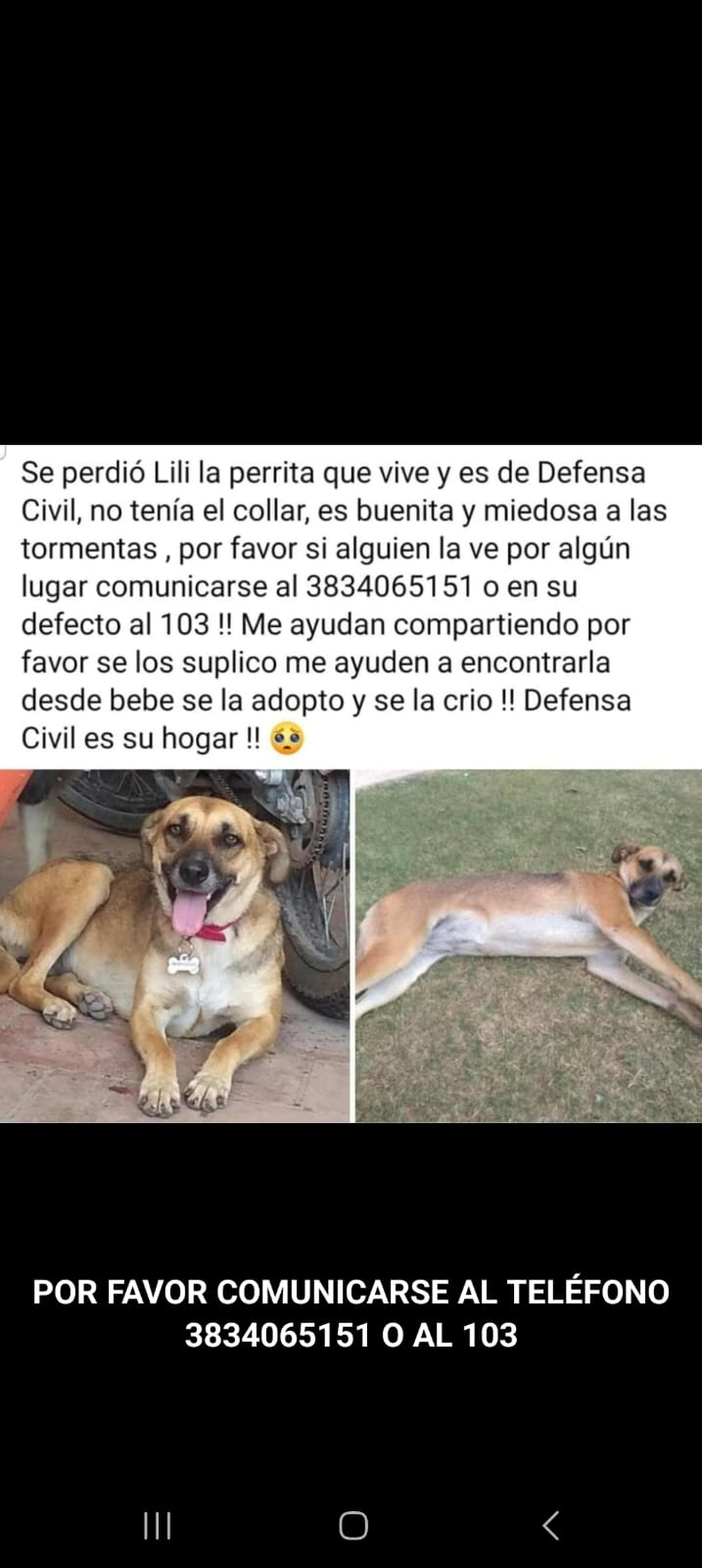 Defensa Civil de la Provincia solicita la colaboración de la comunidad para encontrar a “Lili”, la perrita que forma parte del organismo y que se extravió en las últimas horas, en un contexto marcado por las tormentas registradas en la Capital. Según se informó, la perra no llevaba collar al momento de perderse, es de carácter dócil y suele asustarse con los ruidos fuertes, lo que podría haber provocado que se desorientara. Desde Defensa Civil señalaron que Lili fue adoptada desde muy pequeña y criada dentro del organismo, que es su hogar desde cachorro.