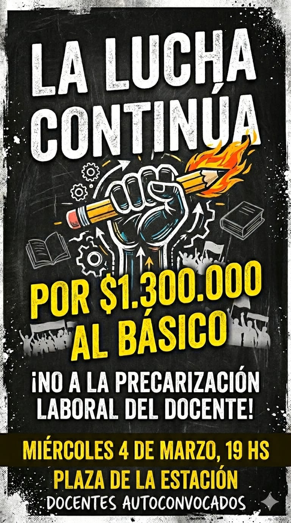 Docentes autoconvocados convocaron a una movilización para el miércoles 4 de marzo a las 19 en la plaza 25 de Agosto, desde donde marcharán hacia la plaza 25 de Mayo, en la Capital. La protesta se enmarca en el reclamo por un salario básico de $1.300.000 y en rechazo a la precarización laboral. “$1.300.000 al básico no es un capricho, es justicia. Nos precarizaron el salario, pero no van a precarizar nuestra dignidad”, expresaron en la convocatoria.