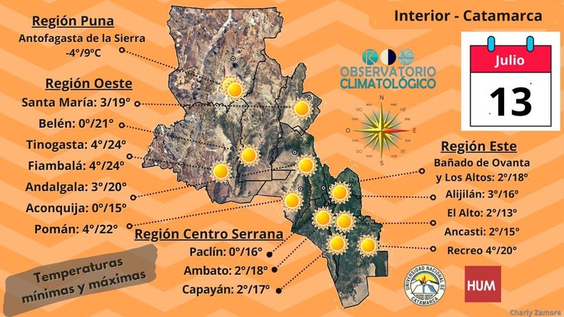 De acuerdo con lo informado desde el del Observatorio Climatológico de la Universidad Nacional de Catamarca, el pronóstico del tiempo indica que el día de hoy tendremos el cielo despejado, la temperatura máxima alcanzará los 20ºC, los vientos serán leves, con intensidad entre 12 a 19km/h en direcciones variables. Mañana jueves los cielos seguirán despejados con una temperatura muy similar a la de hoy y vientos leves a regulares; pero para el viernes el viento rotará y será del sur, tendremos otro ingreso importante de una masa de aire frío que traerá mucha nubosidad, descenso en las temperaturas y bajas probabilidades de precipitaciones.