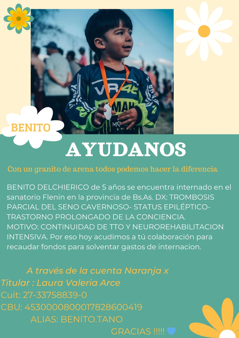 Benito Delchierico, de 5 años, fue trasladado en avión sanitario al Centro Neurológico FLENI de Buenos Aires con un cuadro de trombosis parcial del seno cavernoso, status epiléptico y trastorno prolongado de la conciencia para la continuidad de su tratamiento y neurorehabilitación intensiva.