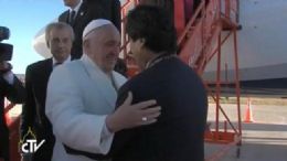 El Santo Padre llegó a las 17.15 hora de Bolivia, una hora después de lo previsto y fue recibido por el presidente Evo Morales que se dirigió al "Campus Papal", un espacio especialmente acondicionado en el aeropuerto, en donde habló a la multitud antes de iniciar su vista de dos días al país del altiplano.