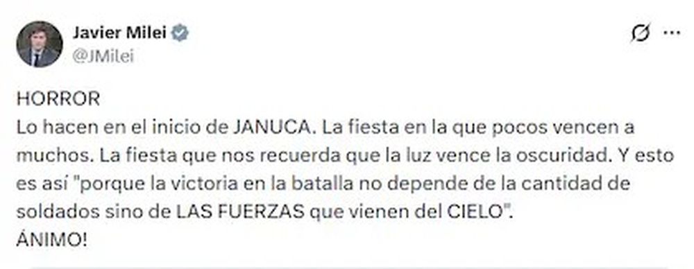 Javier Milei condenó en sus redes sociales el atentando terrorista contra la comunidad judía en Australia, que dejó un saldo de al menos 11 muertos. "HORROR. Lo hacen en el inicio de JANUCA. La fiesta en la que pocos vencen a muchos. La fiesta que nos recuerda que la luz vence la oscuridad. Y esto es así 'porque la victoria en la batalla no depende de la cantidad de soldados sino de LAS FUERZAS que vienen del CIELO'. ÁNIMO!", posteó el Presidente.