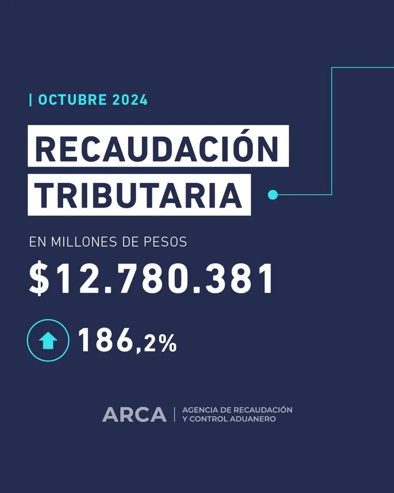 La Agencia de Recaudación y Control Aduanero (ARCA), el organismo creado por el Gobierno y que reemplazó a la ex Administración Federal de Ingresos Públicos (AFIP), informó este viernes que la recaudación tributaria de octubre fue de $12.780.381 millones.