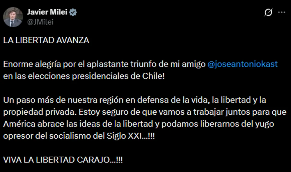El presidente Javier Milei celebró el resultado que dio como ganador de su par electo de Chile, José Antonio Kast, y calificó de “aplastante” el triunfo de “su amigo”. El mandatario argentino valoró el resultado y aseguró que es “un paso más” en América Latina, para que se defienda “la vida, la libertad y la propiedad privada”. “Estoy seguro de que vamos a trabajar juntos para que América abrace las ideas de la libertad y podamos liberarnos del yugo opresor del socialismo del Siglo XXI...!!!”, concluyó desde sus redes sociales.