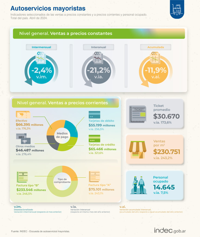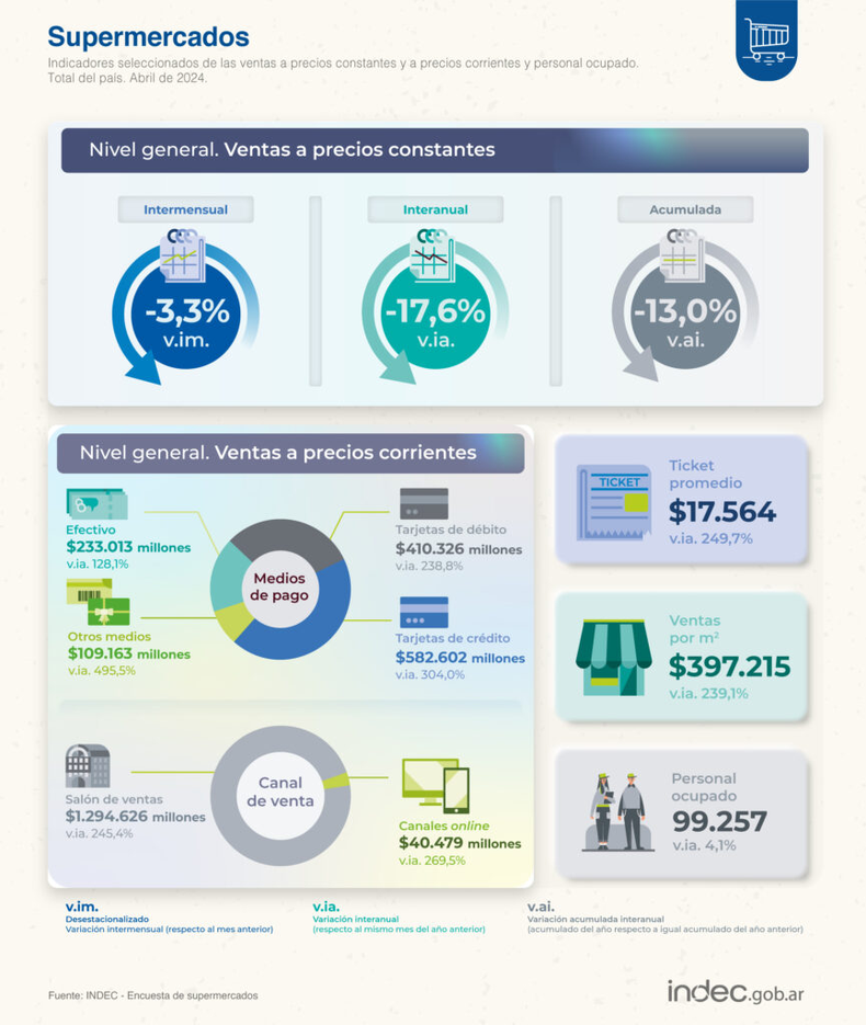 Según los datos publicados por el Indec, este es el sexto mes consecutivo en el que el índice de ventas cae. En el caso de los supermercados, las ventas del último mes bajaron un 3,3% y esta caída sumó un 17,6% interanual. Los datos del relevamiento muestran que las ventas de supermercados acumulan seis meses consecutivos en baja: noviembre (-1,7%), diciembre (-6,6%), enero (-13,9%), febrero (-11,4%), marzo (-9,3%) y abril (-17,6%).